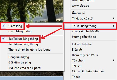 Lưu ý là nhớ bấm chuột phải vào icon dưới khay hệ thống, chọn 'Tối ưu băng thông' và tích chọn 2 mục 'Giảm Ping', 'Bật Tối ưu băng thông' như trong hình